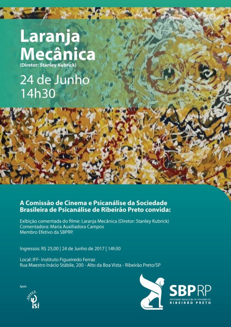No dia 24 de junho, o Cinema e Psicanálise de Ribeirão Preto irá apresentar o filme “Laranja Mecânica” (1971), do renomado diretor Stanley Kubrick, com comentários de Maria Auxiliadora Campos, membro efetivo da SBPRP.