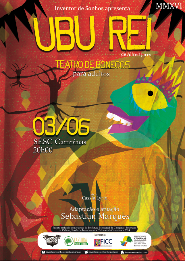 Ubu Rei é uma peça teatral que se encontra em cartaz no Teatro Sesc-Pinheiros até o final desse mês de junho (25/06/2017), protagonizada por Marco Nanini e Rosi Campos. Foi reescrita em 1896 por Alfred Jarry, dramaturgo francês, que a teria escrito inicialmente com amigos de liceu, em 1888, para satirizar um professor em seus aspectos mais grotescos e desumanos. Achei essa montagem muito interessante por representar muito do que vivemos em nossos dias, e por possibilitar reflexões sobre um tema tão antigo quanto atual. Porque é parte da natureza humana mais íntima.