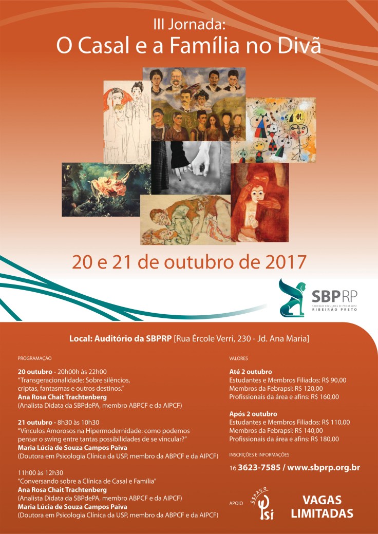 É com grande alegria que o Grupo Casal e Família da SBPRP quer convidá-los para nossa “III Jornada: O Casal e a Família no Divã”. O evento acontecerá nos dias 20 e 21 de outubro de 2017. Com temas instigantes e atuais, acreditamos que teremos uma boa conversa!
