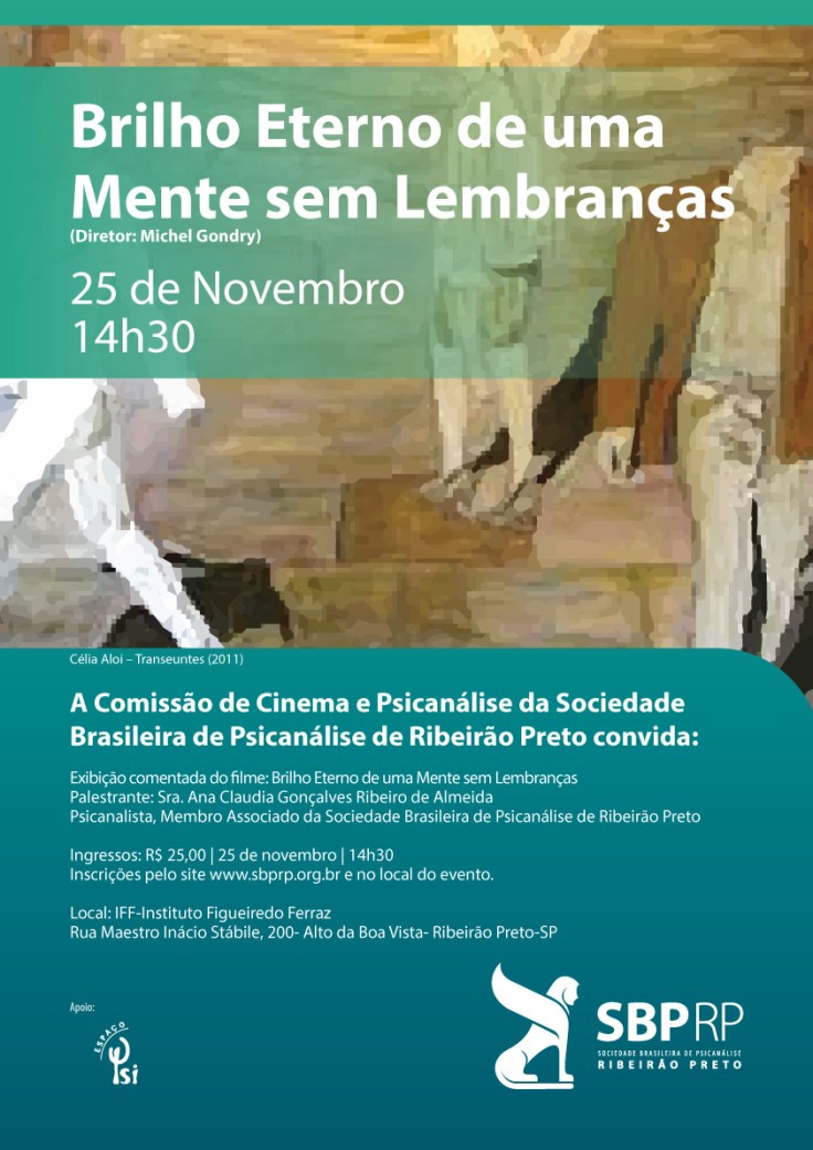 No dia 25 de novembro, o Cinema e Psicanálise de Ribeirão Preto irá encerrar suas atividades do ano com a apresentação do filme “Brilho eterno de uma mente sem lembranças” (2004), do diretor Michel Gondry. Os comentários serão de Ana Cláudia Gonçalves Ribeiro de Almeida, membro associado da SBPRP.