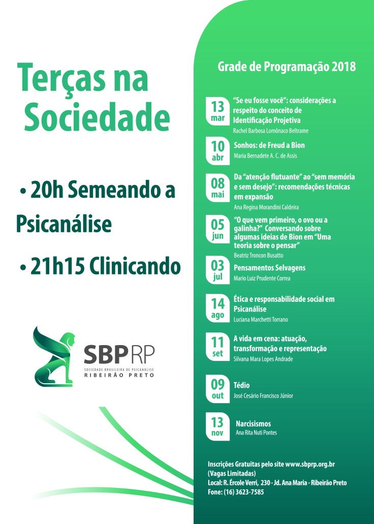 Em nome da Comissão do Terças na Sociedade da SBPRP, gostaríamos de apresentar a vocês a programação 2018 do Semeando a Psicanálise. A programação foi escolhida de maneira cuidadosa e antenada às necessidades do nosso público e aos eventos mais importantes que acontecerão este ano no cenário psicanalítico.