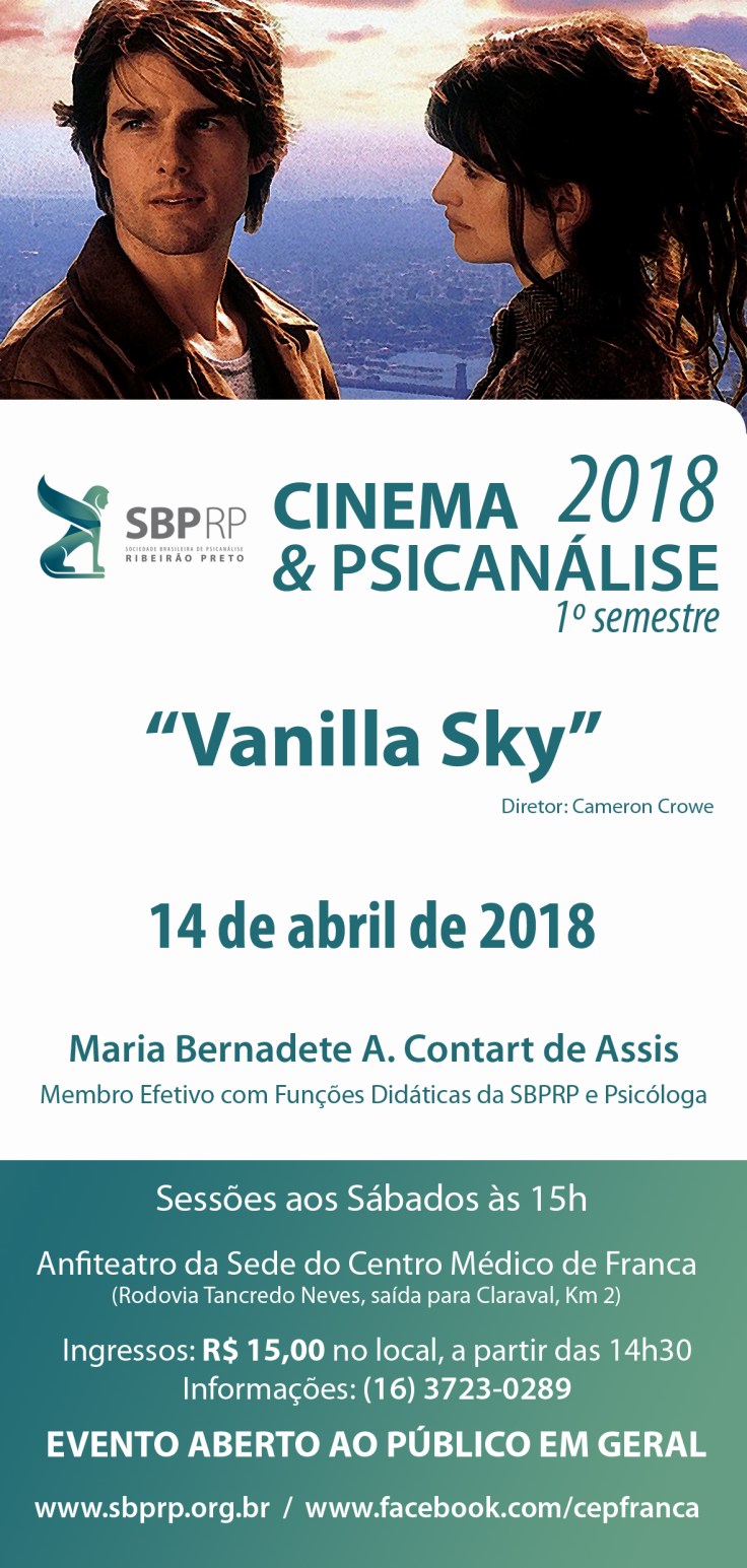 Neste sábado, dia 14 de abril às 15h00, será realizado o C&P de Franca. O filme a ser apresentado é “Vanilla Sky” e os comentários serão de Maria Bernadete A. Contart de Assis, membro efetivo com funções didáticas da SBPRP.