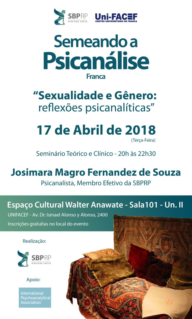 No dia 17 de abril, será realizado o Semeando a Psicanálise em Franca: “Sexualidade e Gênero: reflexões psicanalíticas”, com considerações de Josimara Magro Fernandez de Sousa, membro efetivo da SBPRP: