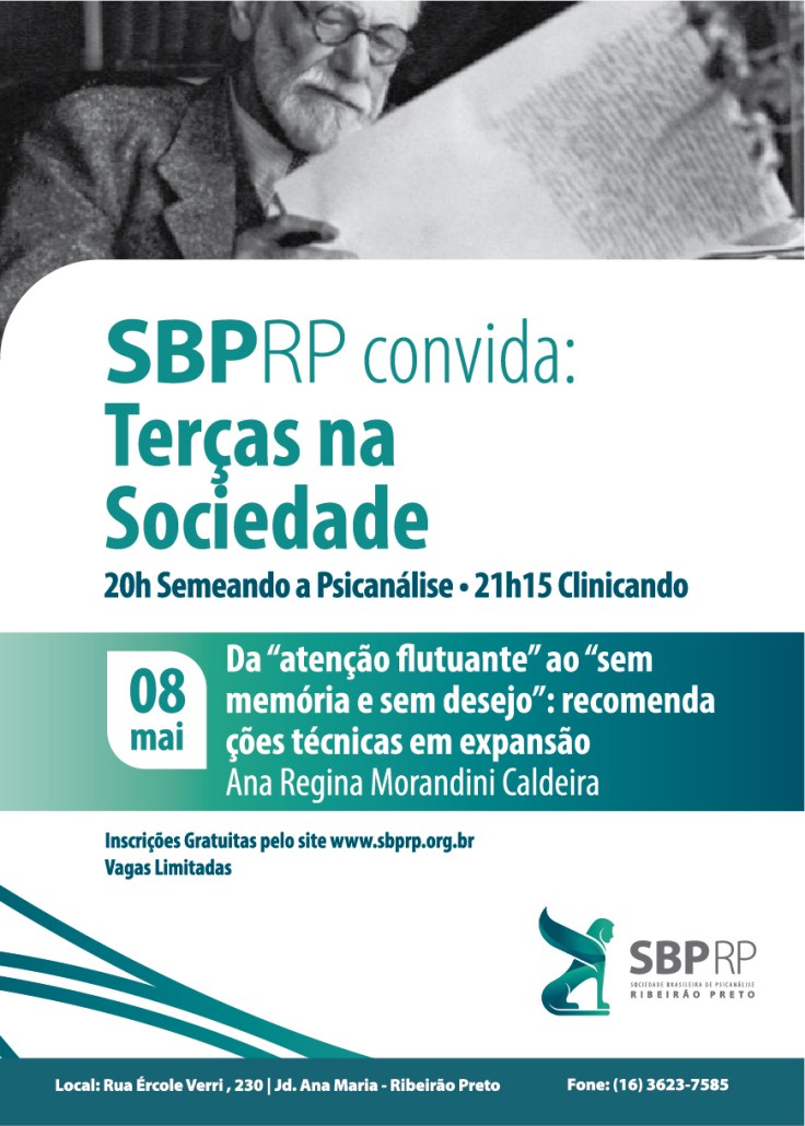 Na próxima terça-feira, dia 08 de maio, será realizado o Terças na Sociedade, desta vez com o tema: Da “atenção flutuante” à “sem memória e sem desejo”: recomendações técnicas em expansão.