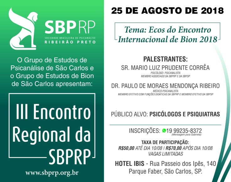 No dia 25 de agosto, às 09h, será realizado o III Encontro Regional da SBPRP, com o tema “Ecos do Encontro Internacional Bion2018”, em São Carlos. Leia abaixo o comentário de Sandra Abadia, membro efetivo da SBPRP: