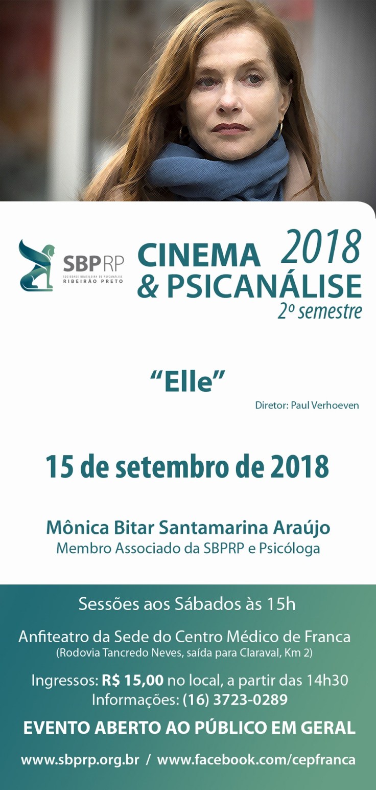 No sábado, dia 15 de setembro, será realizado o próximo C&P de Franca, desta vez com o filme “Elle”. Os comentários serão de Mônica Bitar Santamarina Araújo, membro associado da SBPRP. Saiba mais: