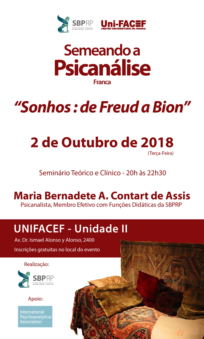 Na próxima terça-feira, dia 02 de outubro, será realizado o Semeando a Psicanálise em Franca. Desta vez os comentários serão de Maria Bernadete A. Contart de Assis sobre o tema: “Sonhos: de Freud a Bion”.
