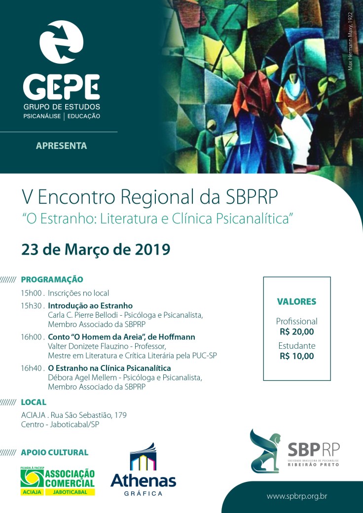 Também fazendo parte desta celebração, o Grupo de Estudos de Psicanálise e Educação (GEPE) de Jaboticabal, em conjunto com a SBPRP, convida todos da região para uma aproximação com estas ideias. Unindo literatura e clínica psicanalítica, este evento é aberto aos que compartilham do interesse ao “estranho” que nos habita.