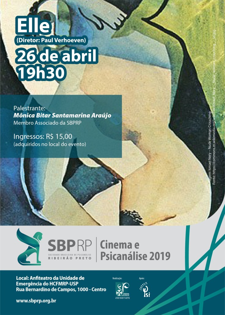 No dia 26 de abril, o Cinema e Psicanálise de Ribeirão Preto fará a exibição do filme ”Elle” (2016), com comentários de Mônica Bitar Santamarina Araújo, psicanalista e membro associado da SBPRP.