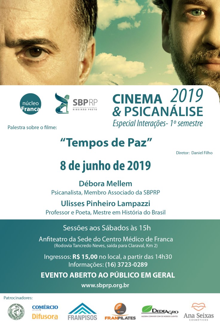 O Cinema e Psicanálise de Franca segue com o Especial Interações. Neste sábado, dia 08 de junho, a dupla Débora Agel Mellem (psicanalista e membro associado da SBPRP) e Ulisses Pinheiro Lampazzi (professor, poeta e mestre em história do Brasil) irá apresentar o filme “Tempos de Paz”, do diretor Daniel Filho.