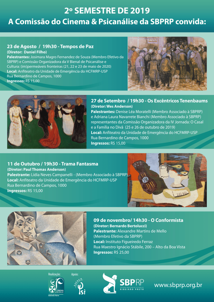 O Cinema & Psicanálise de Ribeirão Preto volta a suas atividades neste segundo semestre com uma novidade: a apresentação de filmes com o tema de dois eventos a serem realizados pela Sociedade: a “IV Jornada: O Casal e a Família no Divã”, com o tema “Famílias, Vínculos e Sexualidades”, e a V Bienal Psicanálise e Cultura, com o tema “(Im)Permeáveis Fronteiras”.