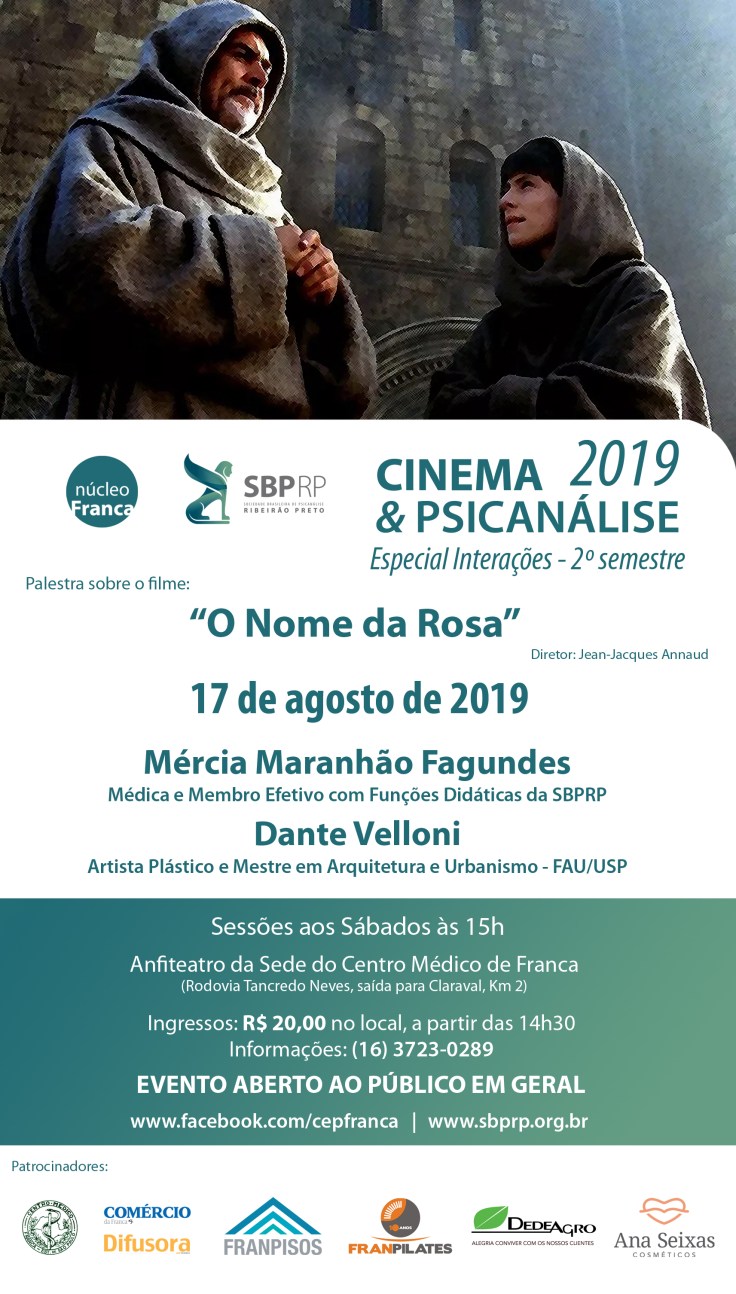 O Cinema e Psicanálise de Franca retoma suas atividades do 2º semestre neste sábado, dia 17. O filme a ser apresentado é “O Nome da Rosa” e os comentários serão de Mércia Maranhão Fagundes, membro efetivo com funções didáticas da SBPRP, e Dante Velloni, artista plástico e mestre em arquitetura e urbanismo: