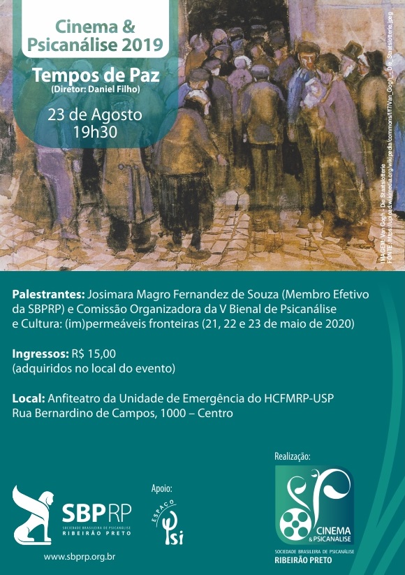 Em 2020, a SBPRP realizará sua V Bienal de Psicanálise e Cultura, com o tema “(Im)Permeáveis Fronteiras”. Conversar sobre “Tempos de Paz” será uma ótima forma de iniciar os debates sobre esse tema, que inclui muitas questões: a fronteira como um não-lugar; a relação com o estrangeiro e com a alteridade; o autoritarismo e a a obediência cega; a importância da arte e sua força transformadora. A comissão organizadora da Bienal estará presente para trocar ideias sobre o filme e esses temas.