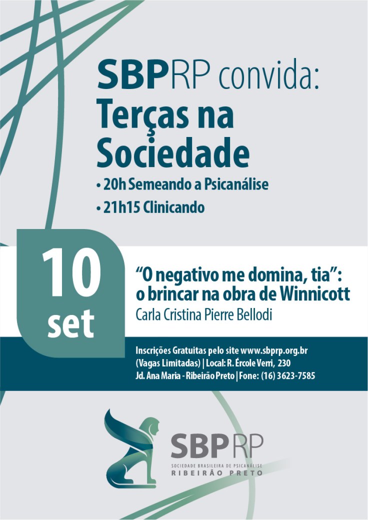 No dia 10 de setembro será realizado o próximo Terças na Sociedade. Desta vez, Carla Cristina Pierre Bellodi irá comentar o tema “O negativo me domina, tia”: o brincar na obra de Winnicott.