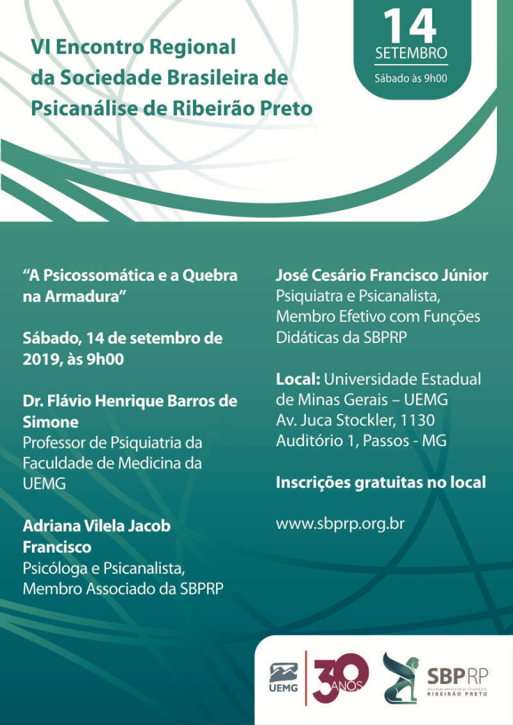 A Diretoria Regional da SBPRP dá continuidade ao seu trabalho de cultivar a psicanálise nas cidades da nossa região, promovendo reflexões sobre vários temas e intercâmbios com instituições de cada comunidade. No dia 14 de setembro será realizado em Passos (MG) o nosso VI Encontro Regional – “A Psicossomática e a Quebra na Armadura”.