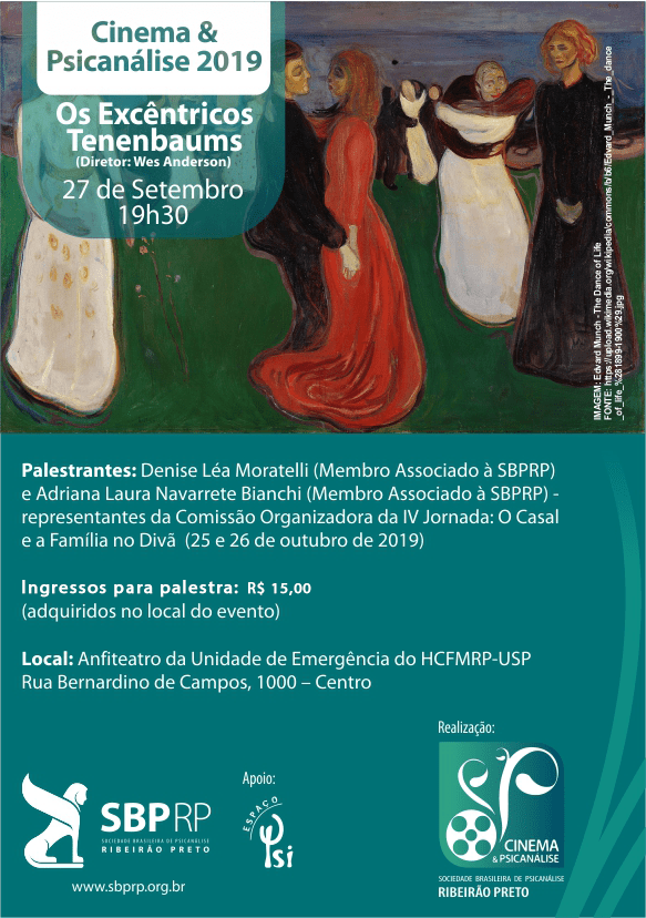 O C&P será realizado no dia 27 de setembro, com a exibição do filme “Os Excêntricos Tenenbaums”, com comentários de Denise Léa Moratelli e Adriana Laura Navarrete Bianchi, membros associados da SBPRP.