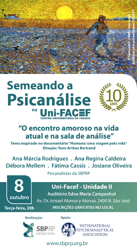 O Semeando a Psicanálise – Franca está completando 10 anos de funcionamento. É um projeto que visa o intercâmbio da SBPRP com as Universidades, cultivando o interesse pelo estudo da teoria e técnica psicanalítica. Para celebrar este trabalho de parcerias, será realizado no dia 8 de outubro, na Uni-Facef, o evento “O encontro amoroso na vida atual e na sala de análise”, tema inspirado no documentário “Humano: uma viagem pela vida”, de Yan Arthus Bertrand.
