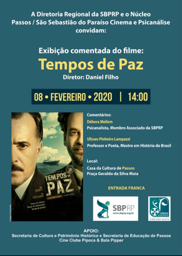 A Diretoria Regional da SBPRP e a Comissão Organizadora da V Bienal de Psicanálise e Cultura promovem no dia 8 de fevereiro, sábado, às 14h, em Passos – MG, a exibição comentada do filme “Tempos de Paz”, que será comentado por Débora Agel Mellem, psicanalista e membro associado da SBPRP, e Ulisses Pinheiro Lampazzi, professor e poeta, mestre em História do Brasil.
