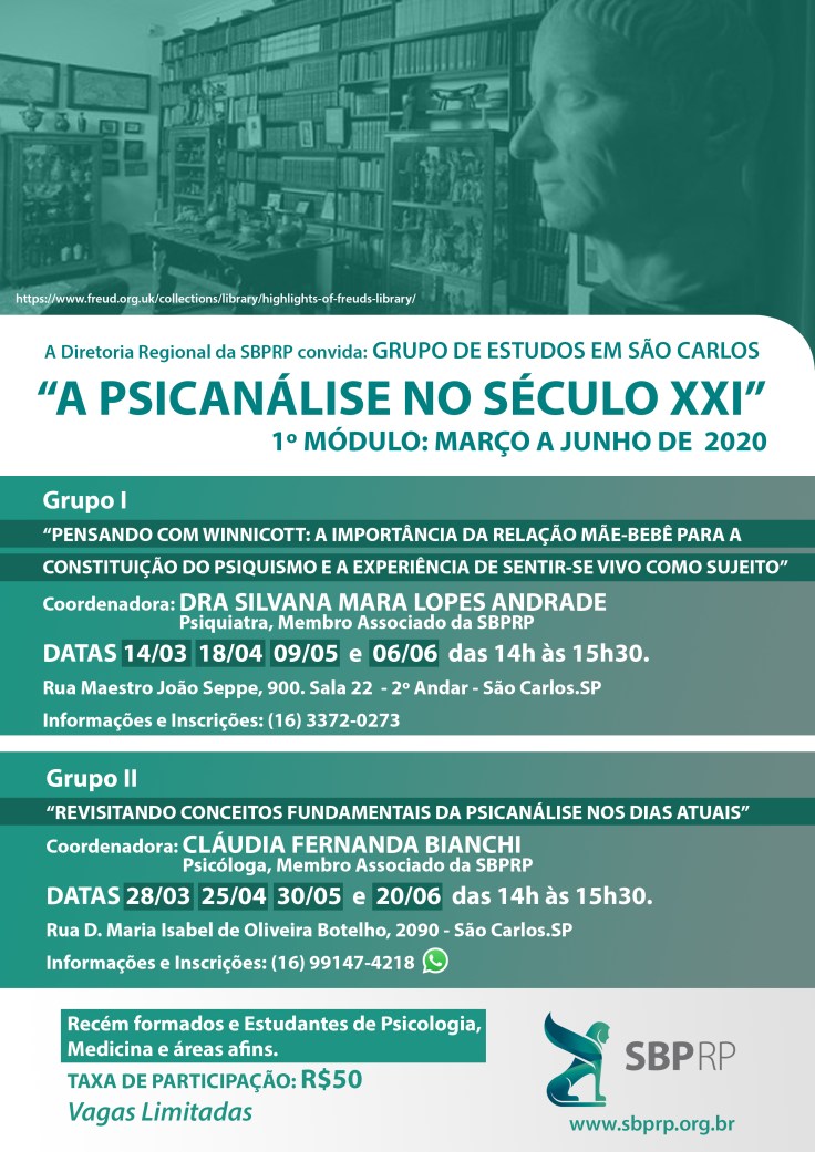 O primeiro módulo dos estudos acontecerá na cidade de São Carlos com a temática: “A Psicanálise no século XXI”. A coordenação dos grupos será das psicanalistas Cláudia Fernanda Bianchi e Silvana Mara Lopes Andrade.