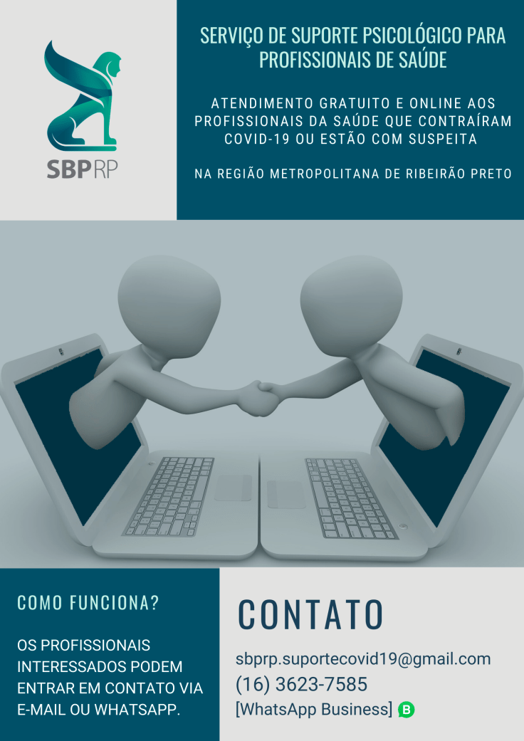 Em tempos sombrios da pandemia, enquanto fronteiras se fecham e o isolamento se impõe para contenção do vírus COVID-19, a Diretoria de Cultura e Comunidade e a Diretoria Científica, juntamente com todo o Conselho Diretor da SBPRP, anuncia a criação do Serviço de Suporte Psicológico para Profissionais de Saúde.