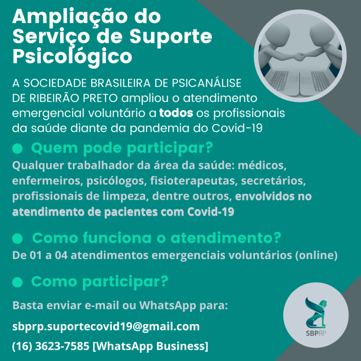 Seguindo a linha inspirada no poema “Tecendo a Manhã” de João Cabral de Melo Neto, e na esperança de que de fato tenhamos um amanhã – e de preferência, um bom “amanhã” – a Sociedade Brasileira de Psicanálise de Ribeirão Preto (SBPRP) comunica a ampliação do Projeto Suporte Psicológico, passando a incluir o atendimento de todos os funcionários da saúde da região de Ribeirão Preto que trabalham em locais que atendam pacientes com Covid-19 e não apenas os suspeitos ou contaminados pelo Covid-19.