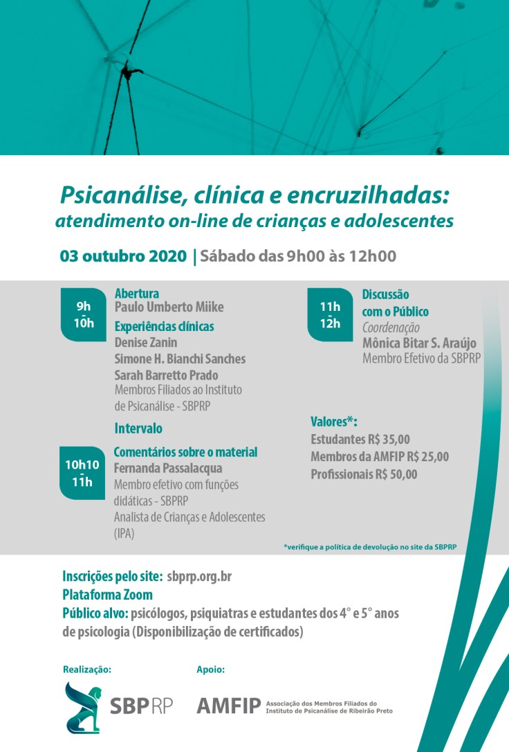 O evento está sendo realizado pela SBPRP, numa parceria entre a AMFIP (Associação dos Membros Filiados do Instituto da SBPRP) e a Diretoria de Tecnologia da SBPRP. Será realizado no modelo on-line, no dia 3 de outubro, das 09h00 às 12h00, pela plataforma Zoom. As inscrições estão disponíveis pelo site da SBPRP e serão oferecidos certificados. Esperamos por vocês!