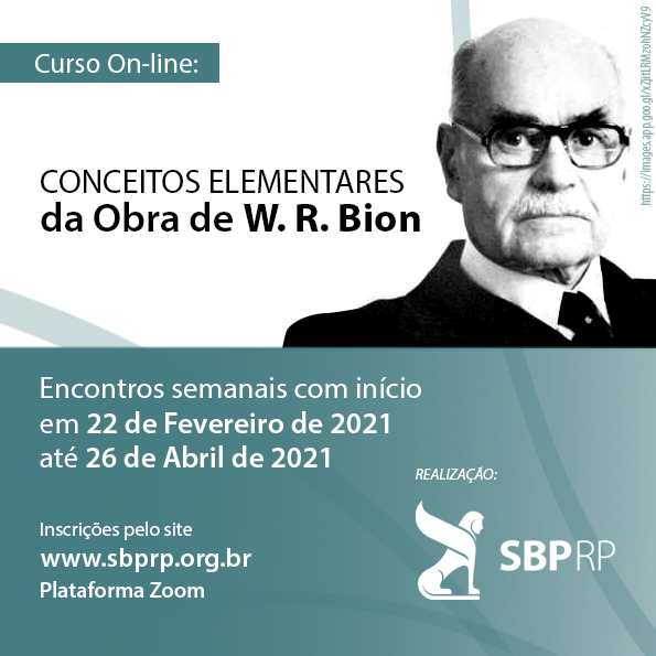 A SBPRP, através de sua Diretoria de Tecnologia – Comissão de Projetos, realizará entre Fevereiro e Abril de 2021 o curso on-line: ” Conceitos Elementares da Obra de Bion”.