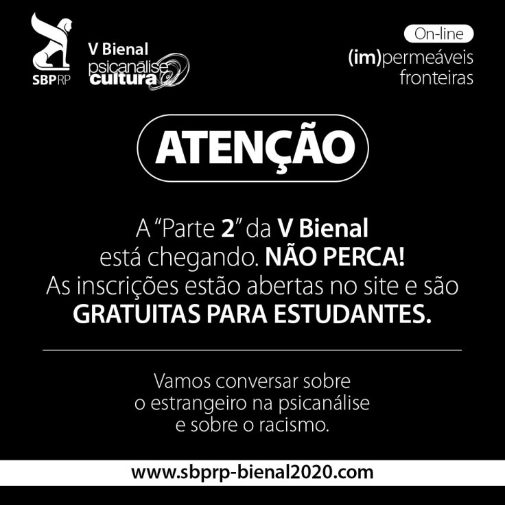 Vamos acrescentar mais estímulos a estas reflexões com a V Bienal de Psicanálise e Cultura – Parte 2: o estrangeiro na psicanálise e o racismo. Inscrições até o dia 03 de fevereiro, cliquei aqui para garantir a sua vaga!