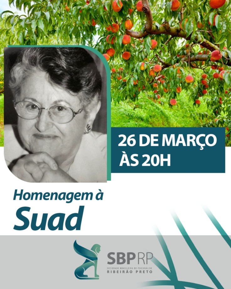 No dia 26 de março de 2021, a Sociedade Brasileira de Psicanálise de Ribeirão Preto (SBPRP) realizará uma homenagem à Dra. Suad Haddad pela sua presença inspiradora no cenário psicanalítico.