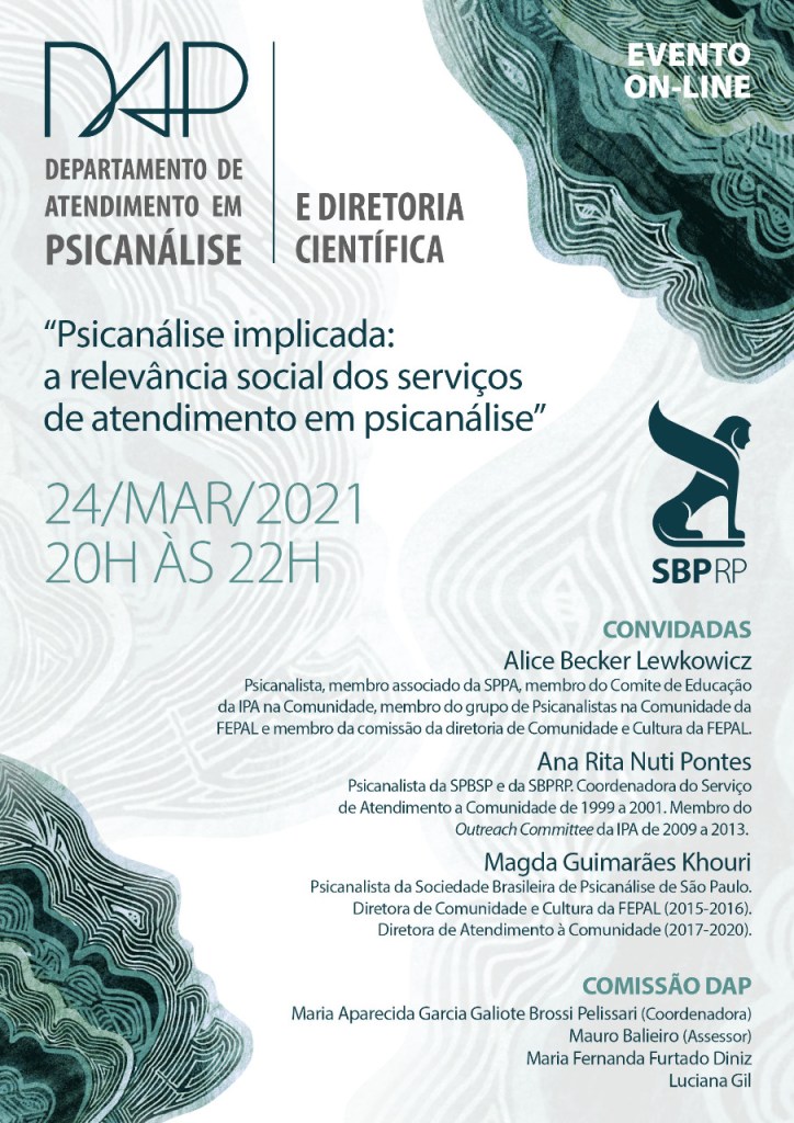 Participaram como palestrantes Ana Rita Nuti Pontes, membro efetivo com funções didáticas da SBPRP, Alice Becker Lewkowicz, membro associado da SPPA, e Magda Guimarães Khouri, membro associado da SBPSP.