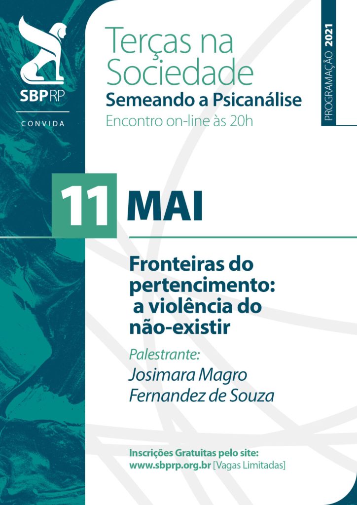 O próximo encontro on-line do Terças na Sociedade acontecerá no dia 11 de maio, às 20h. Desta vez contaremos com a presença da psicanalista Josimara Magro Fernandez de Souza, membro efetivo da SBPRP, falando sobre o tema “Fronteiras do pertencimento: a violência do não-existir”. Esperamos vocês!