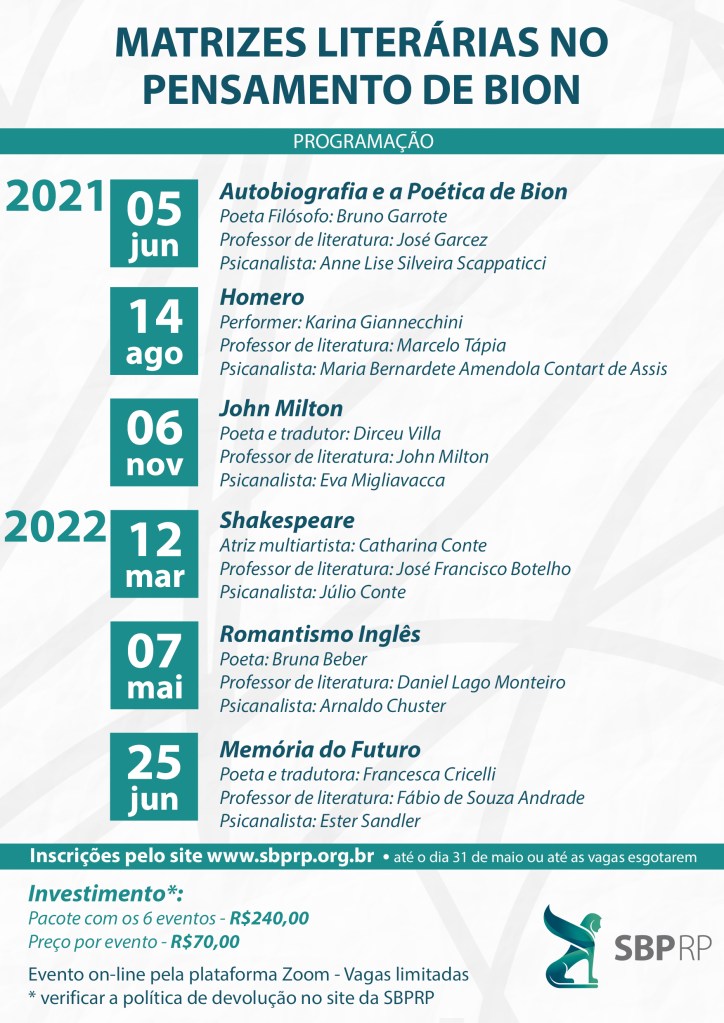 Dando continuidade ao projeto “Matrizes”, a Comissão do Espaço Cultural da SBPRP tem o prazer de convidar a todos para o curso on-line: MATRIZES LITERÁRIAS NO PENSAMENTO DE BION.