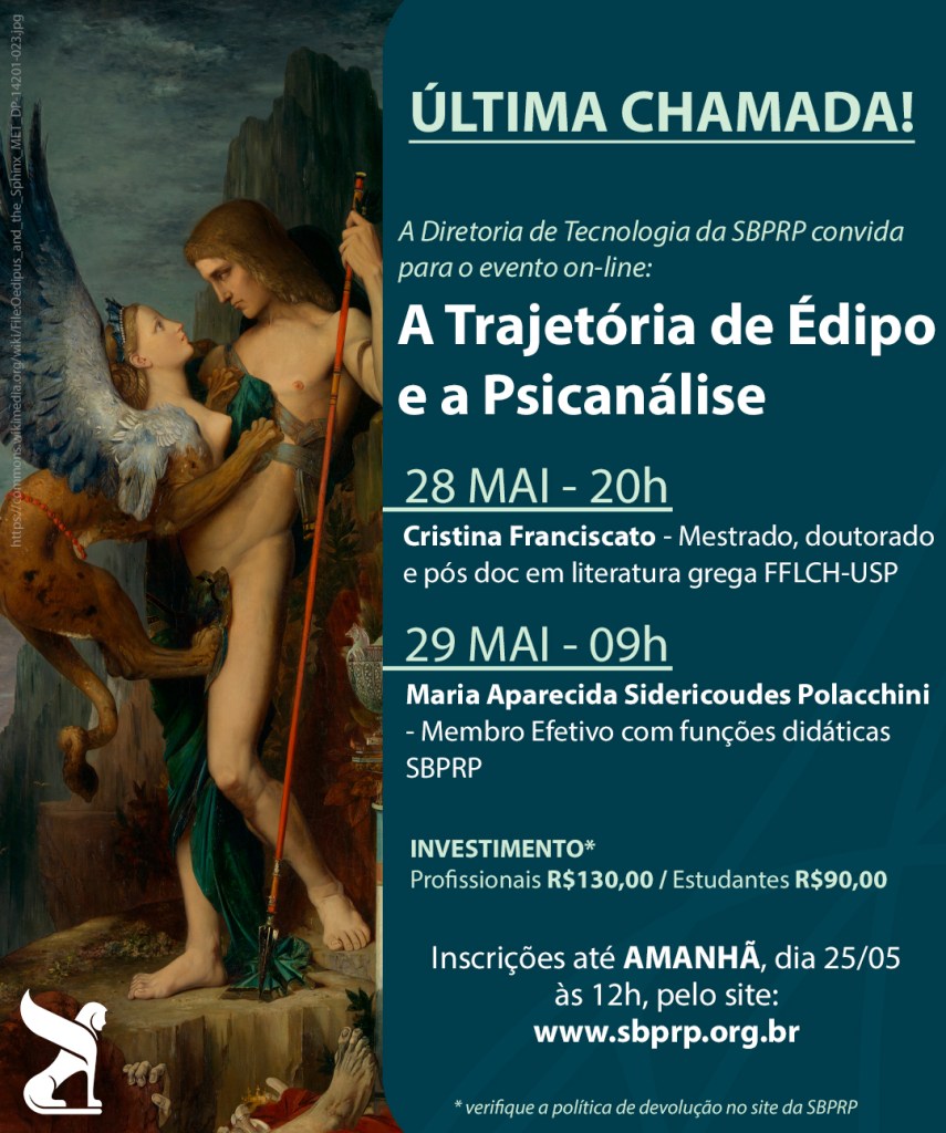 Inscrições até amanhã, dia 25, às 12h pelo site: https://sbprp.org.br/eventos/events/a-trajetoria-de-edipo-e-a-psicanalise-com-cristina-franciscato/