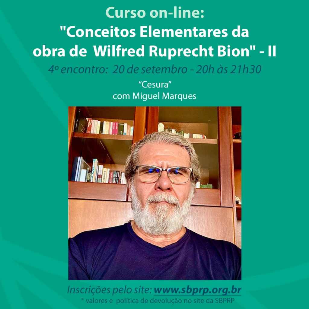 No nosso quarto encontro do Curso On-line sobre os “Conceitos Elementares da Obra de W. R. Bion – II”, o nosso atual Presidente, o psicanalista Miguel Marques, irá ministrar uma videoaula intitulada “Cesura”.