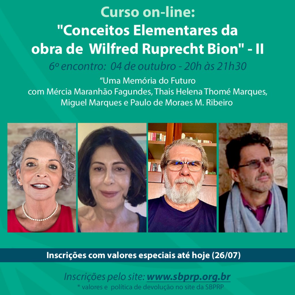 No sexto encontro do Curso Online sobre os “Conceitos Elementares da Obra de W. R. Bion – II”, a Diretora do nosso Instituto de Psicanálise, a Mércia Maranhão Fagundes, a nossa Diretora Científica, Thais Helena Thomé Marques e o nosso Presidente, Miguel Marques, irão apresentar um texto-fílmico de sua autoria baseado no tema “Uma Memória do Futuro” de Bion, que será comentado livremente pelo nosso Diretor de Tecnologia, Paulo de Moraes M. Ribeiro. Em seguida, abriremos para o debate com todos os participantes.