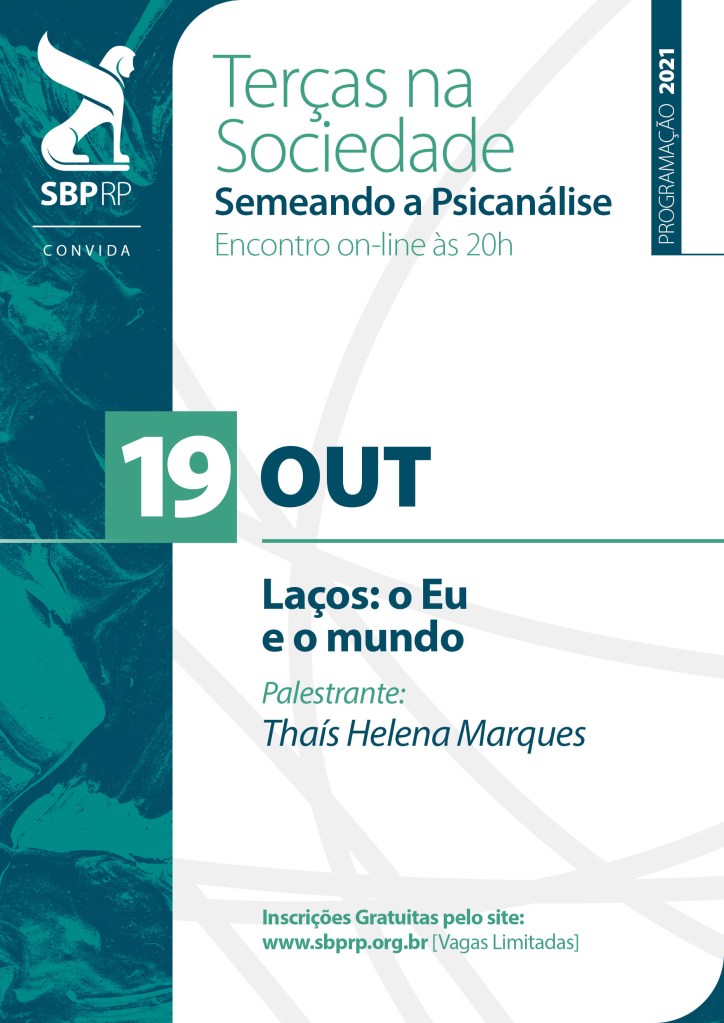A próxima edição do Terças na Sociedade acontecerá no dia 18 de outubro, às 20h. Desta vez contaremos com a participação da psicanalista Thaís Helena Marques, Membro Efetivo com Funções Didáticas da SBPRP, que falará sobre o tema “Laços: o Eu e o mundo“.