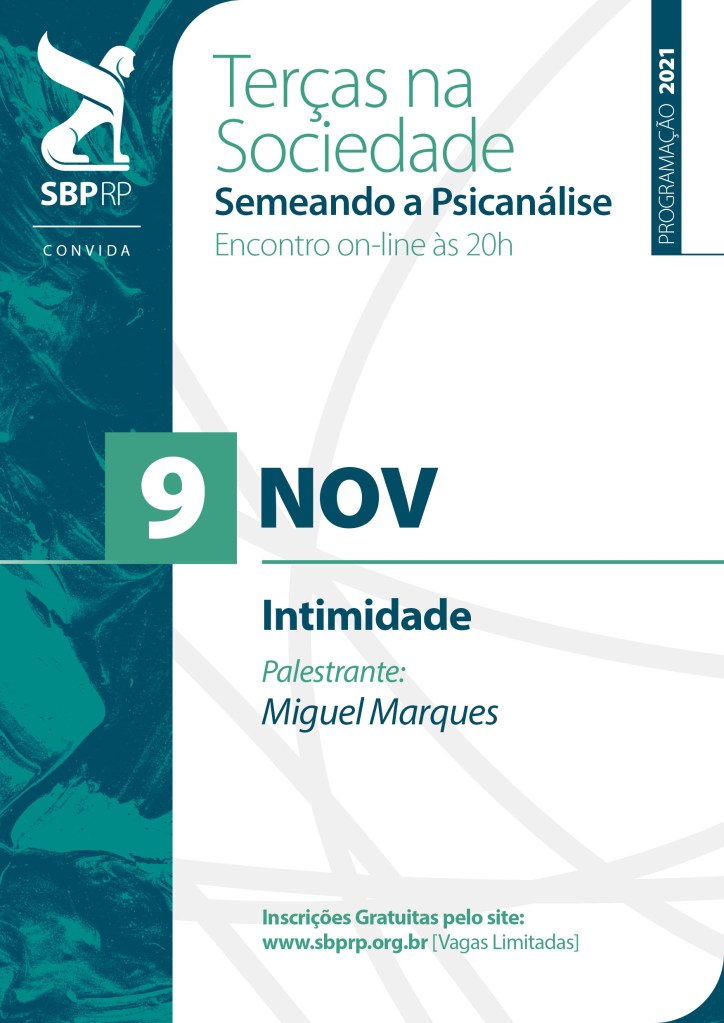 A próxima edição do Terças na Sociedade acontecerá no dia 9 de novembro, às 20h. Desta vez contaremos com a participação do psicanalista Miguel Marques, Presidente e Membro Efetivo com Funções Didáticas da SBPRP, que falará sobre o tema “Intimidade“.
