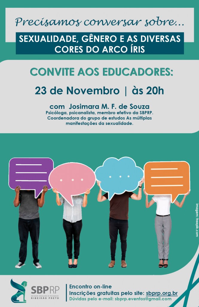 Queremos convidá-los a estarem conosco no dia 23 de novembro às 20h para juntos pensarmos e conversamos sobre sexualidade, gênero e as diversas cores do arco íris. Tema atual e instigante às demandas vividas em diferentes contextos.