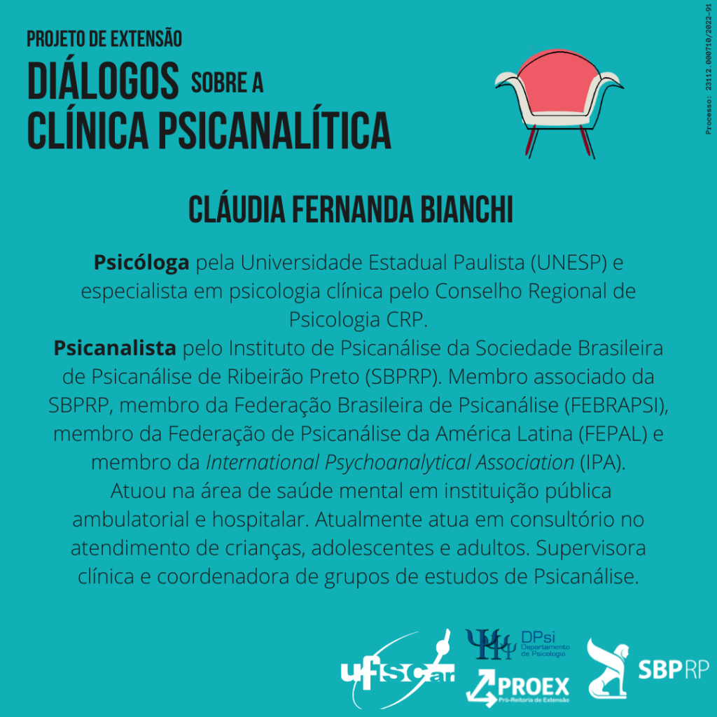 A série de palestras Diálogos sobre a clínica psicanalítica, projeto de extensão de docentes e discentes do Departamento de Psicologia da Universidade Federal de São Carlos (UFSCar), tem por objetivo: fomentar recursos para o início da formação psicanalítica de alunos de graduação em Psicologia e atender demandas características do percurso profissional deste grupo, a partir de palestras.