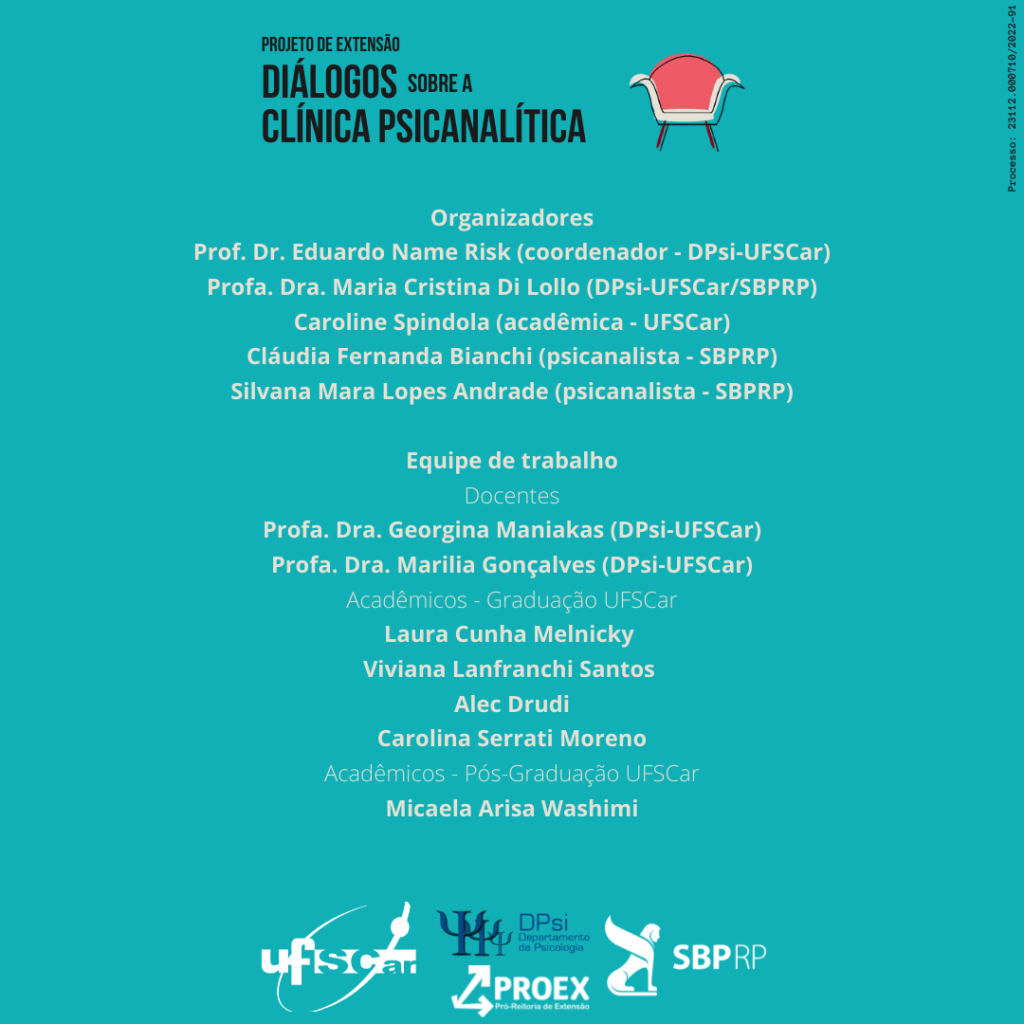 A atividade é organizada pelo Prof. Dr. Eduardo Name Risk (DPsi-UFSCar, coordenador), Profa. Dra. Maria Cristina Di Lollo (DPsi-UFSCar/SBPRP), Caroline Spindola (acadêmica do curso de Psicologia) e pelas psicanalistas, Cláudia Fernanda Bianchi (SBPRP) e Silvana Mara Lopes Andrade (SBPRP), em parceria com a Sociedade Brasileira de Psicanálise de Ribeirão Preto (SBPRP).