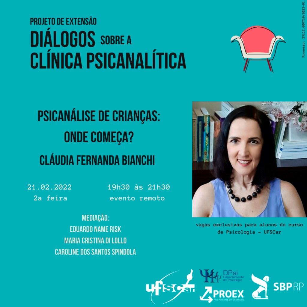 A primeira atividade de 2022 contará com a palestra Psicanálise de crianças: onde começa?, ministrada pela psicanalista Cláudia Fernanda Bianchi, no dia 21 de fevereiro, segunda-feira, das 19h30 às 21h30 (Horário de Brasília), por meio da plataforma Google Meet. A atividade será transmitida ao vivo e não será gravada. A atividade é exclusiva aos alunos do curso de graduação em Psicologia da UFSCar.