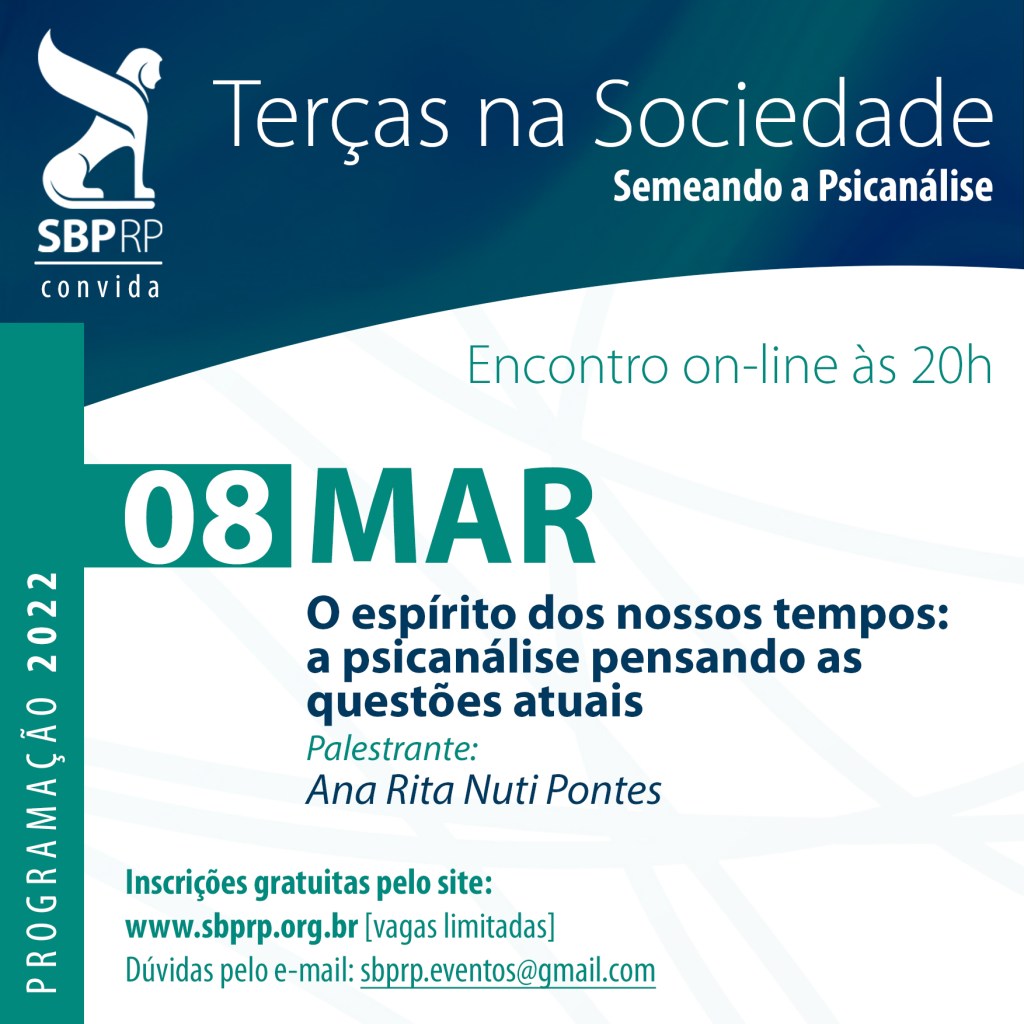 O Terças na Sociedade iniciará seus encontros deste ano de 2022 com a psicanalista, membro efetivo com funções didáticas da SBPRP, Ana Rita Nuti Pontes, trazendo o tema “O espírito dos nossos tempos: a psicanálise pensando as questões atuais”.