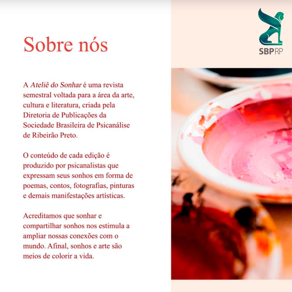 Conheça a nova revista da SBPRP, “Ateliê do Sonhar”, primeira edição gratuita em sua versão on-line disponível no site: https://sbprp.org.br/revista-de-cultura-atelie-do-sonhar/