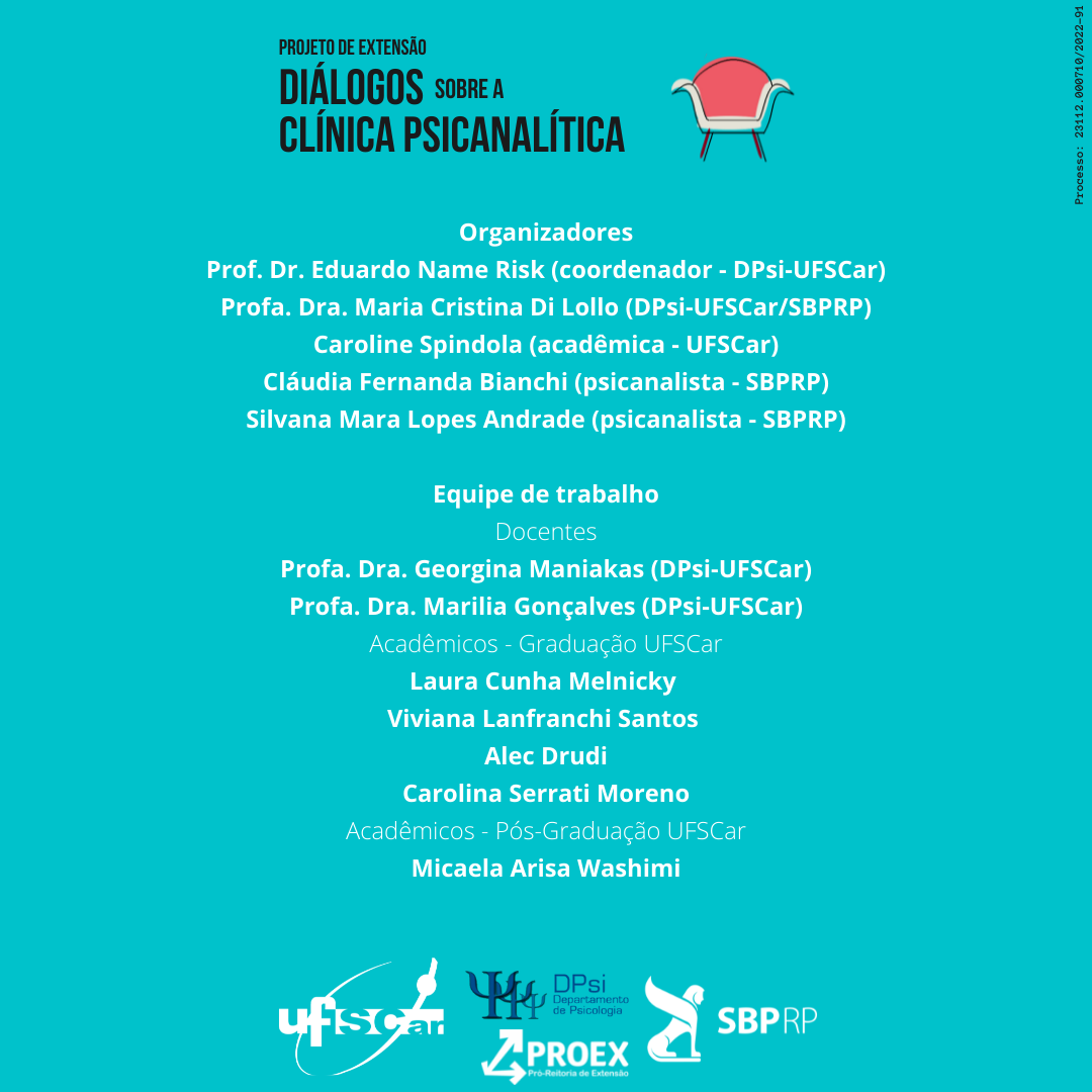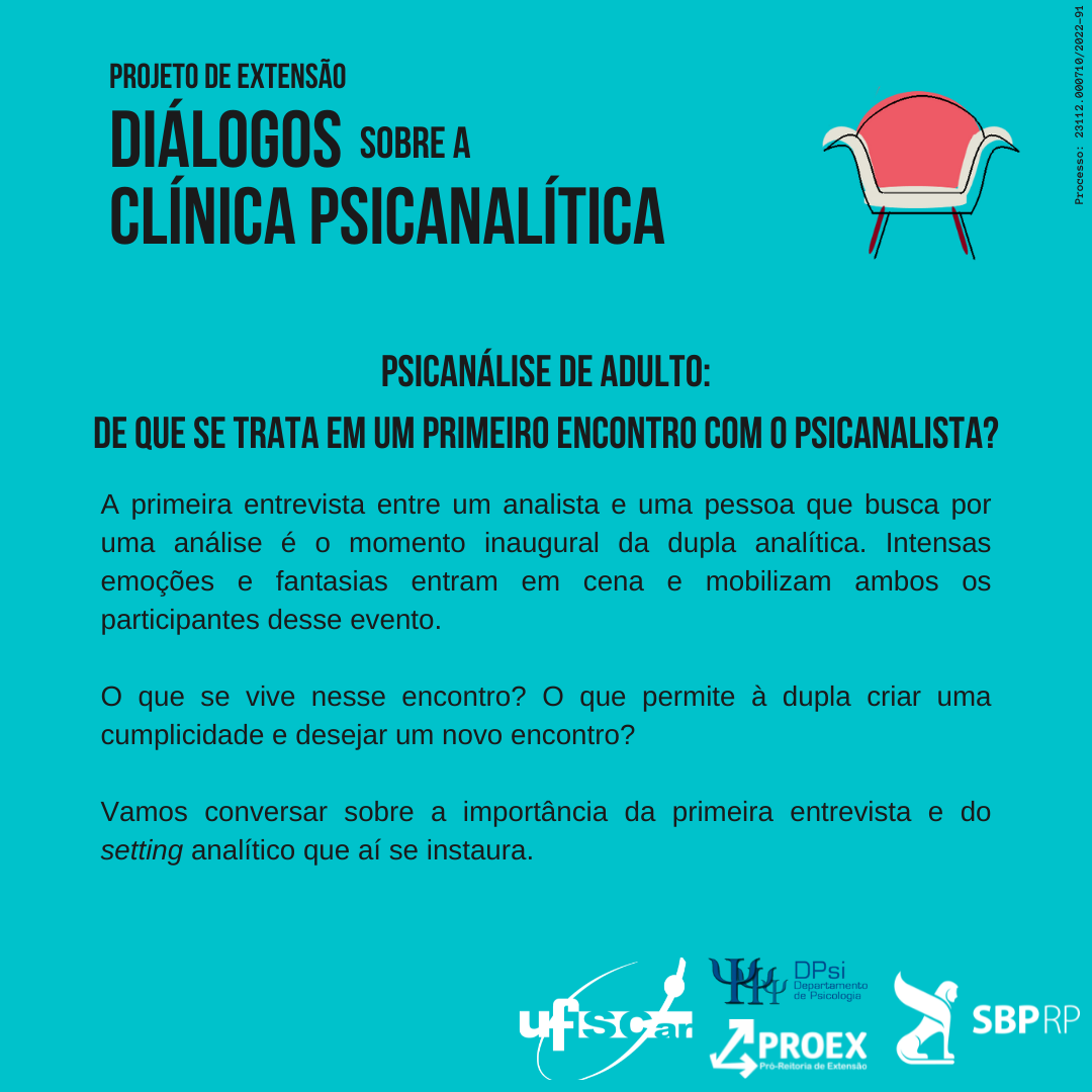 A série de palestras Diálogos sobre a clínica psicanalítica, integra o Projeto de Extensão Diálogos sobre a clínica, vinculado ao Departamento de Psicologia da Universidade Federal de São Carlos (UFSCar), em parceria com a Diretoria Regional da Sociedade Brasileira de Psicanálise de Ribeirão Preto (SBPRP). A atividade tem por objetivo fomentar recursos para o início da formação psicanalítica de alunos de graduação em Psicologia e atender demandas características do percurso profissional deste grupo, a partir de palestras.