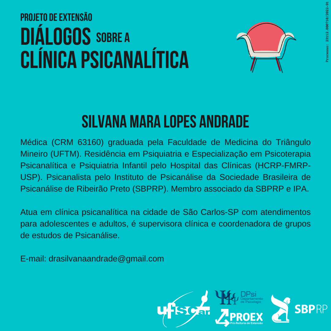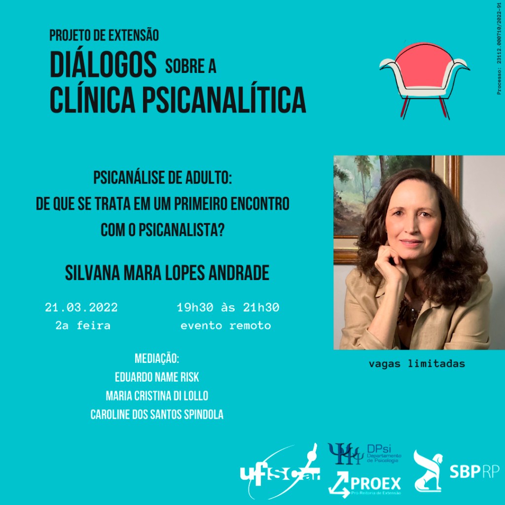 Na parceria com a UFSCar, no dia 21/03/2022, das 19h30 às 21h, Silvana Andrade realizará a palestra “Psicanálise de Adulto: De que se trata em um primeiro encontro com o psicanalista?”. A atividade será on-line, exclusiva aos alunos do curso de graduação em Psicologia da UFSCar.