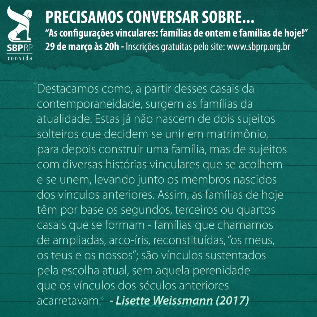O primeiro encontro do Precisamos Conversar Sobre de 2022 conta com a participação da psicanalista Denise Lea Moratelli, membro associado e coordenadora do Grupo Casal e Família da SBPRP, que debaterá sobre o tema “As configurações vinculares: famílias de ontem e famílias de hoje!”.