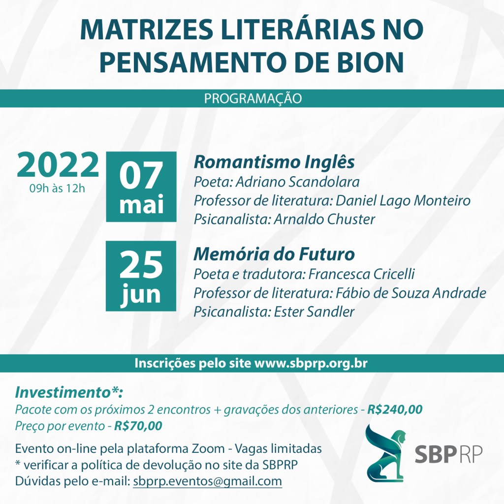 Para trazer esta conexão entro o tema sugerido e os pensamentos de Bion, contaremos com a participação de convidados especiais: o poeta Adriano Scandolara, o professor de literatura Daniel Lago Monteiro e o psicanalista Arnaldo Chuster.