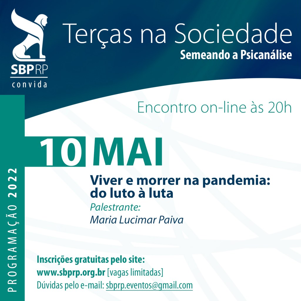 O próximo Terças na Sociedade acontecerá no dia 10 de maio, às 20h. Trazendo o tema “Viver e morrer na pandemia: do luto à luta”, contaremos com a participação de Maria Lucimar Paiva, membro associado da SBPRP.