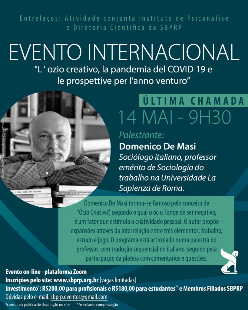 Última chamada para se inscrever no Evento Internacional com o sociólogo italiano Domenico De Masi. O evento on-line L’ozio creativo, la pandemia del COVID 19 e le prospettive per l’anno venturo acontecerá amanhã, 14 de maio, das 9h30 às 12h.