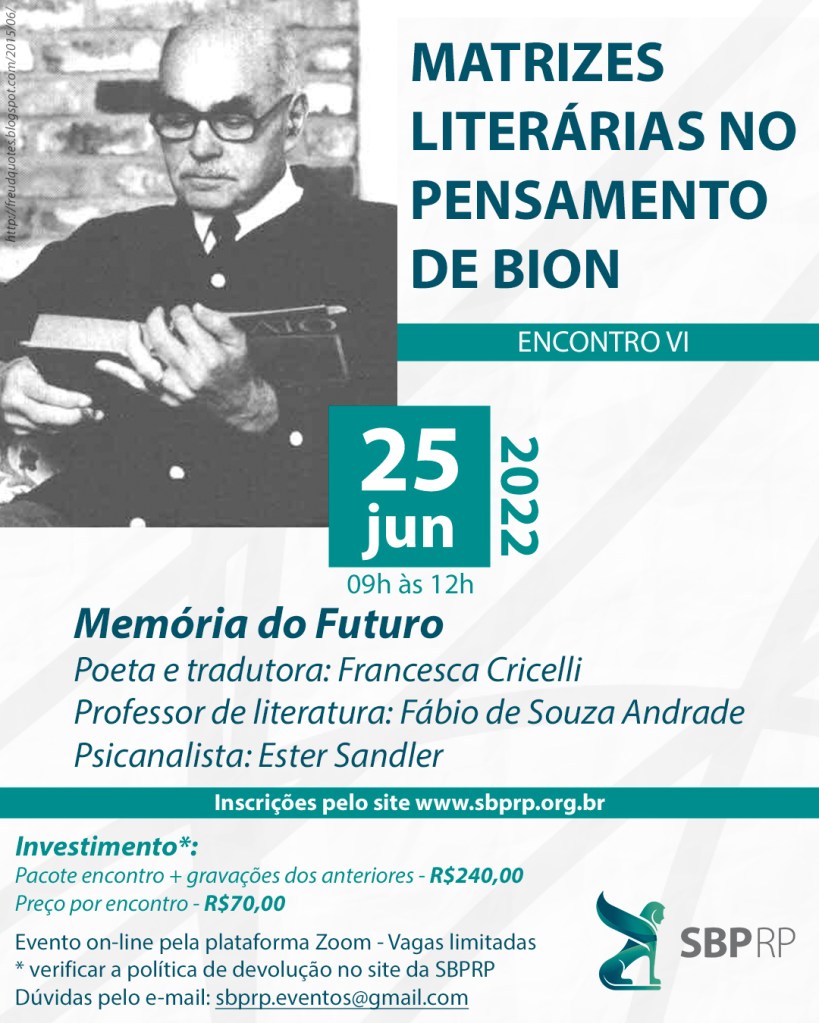 Nosso encerramento contempla a valiosa obra do Dr. Bion composta, por três volumes que leva o nome: Memória do Futuro. Para conduzir nossa viagem teremos convidados que foram especialmente escolhidos para compor uma trinca, que trança a psicanálise, a poesia e a literatura, para tanto teremos uma psicanalista exímia conhecedora da obra de Bion, uma poeta que percorre terrenos estrangeiros da língua, da literatura e da psicanálise e um professor de literatura que aprofundou seus estudos em títulos muito visitados por Bion, como aqueles escritos por Samuel Beckett. Nossos ilustres convidados são: A Dra. Ester Hadassa Sandler médica psicanalista, analista didata da SBPRP, dentre tantas outras funções ela ministra seminários sobre a obra do Dr. Bion; a poeta e tradutora literária Francesca Cricelli que também é doutora em letras estrangeiras e Tradução pela USP; e o Prof. Dr. Fabio Rigatto de Souza Andrade, atualmente professor associado do Departamento de Teoria Literária e Literatura Comparada da USP, e lidera o grupo de pesquisa e Estudo em Samuel Beckett.